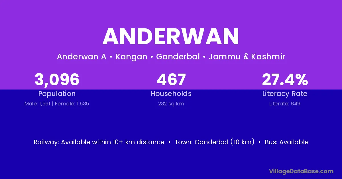 Anderwan village has a total population of 3,096 people, of which 1,561 are males and 1,535 are females.