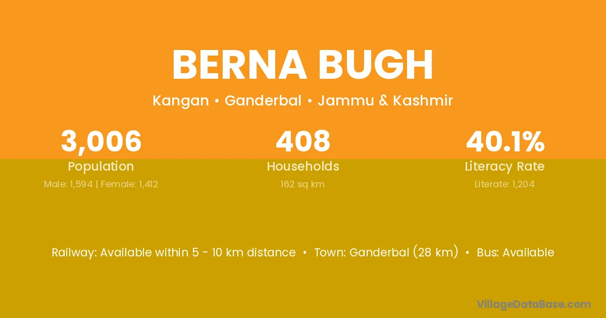 Ganderbal (28 km) is the nearest town to Berna Bugh village for major economic activities and is located approximately 28 km away.