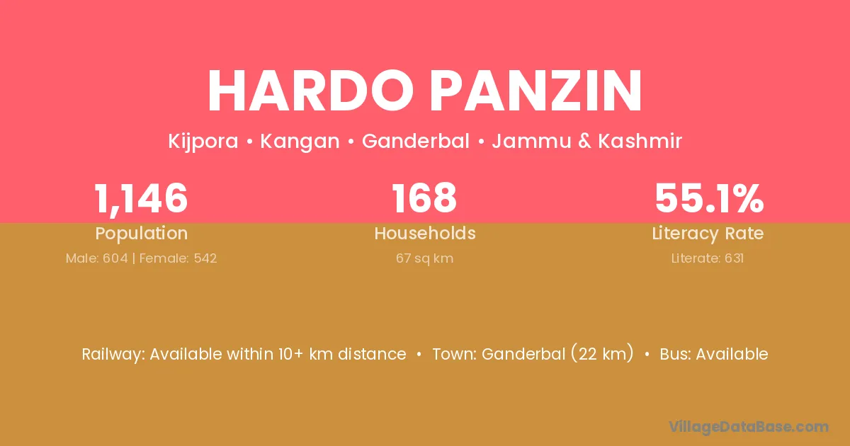 Ganderbal (22 km) is the nearest town to Hardo Panzin village for major economic activities and is located approximately 22 km away.