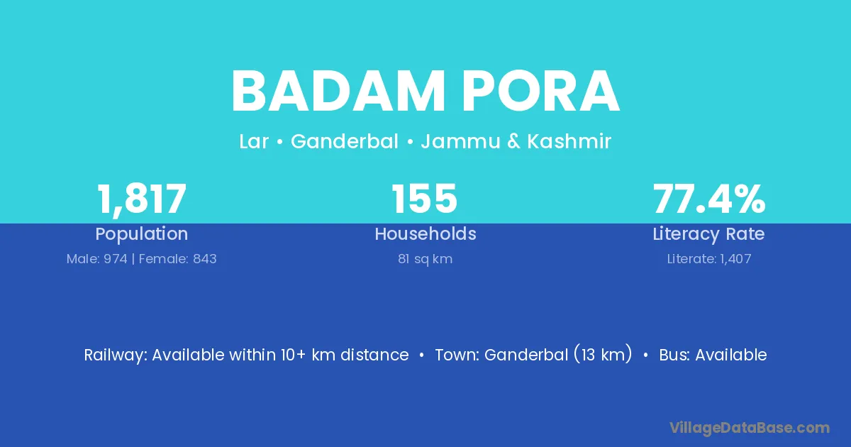 Ganderbal (13 km) is the nearest town to Badam Pora village for major economic activities and is located approximately 13 km away.