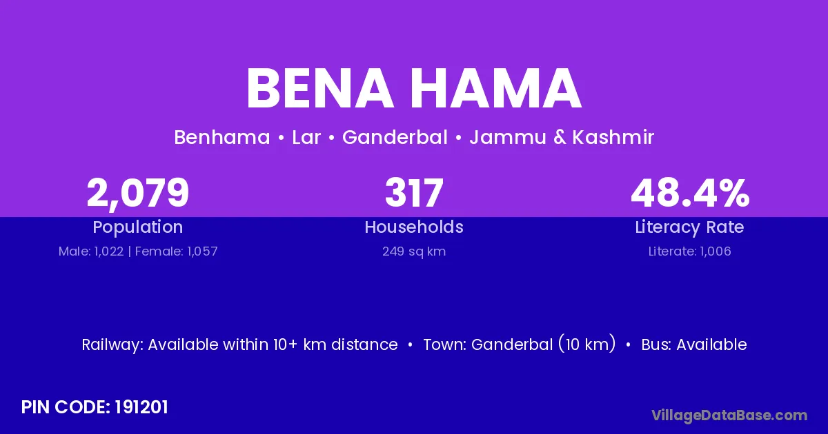 Ganderbal (10 km) is the nearest town to Bena Hama village for major economic activities and is located approximately 10 km away.