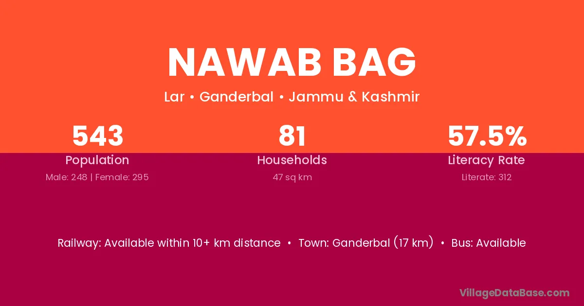 Ganderbal (17 km) is the nearest town to Nawab Bag village for major economic activities and is located approximately 17 km away.