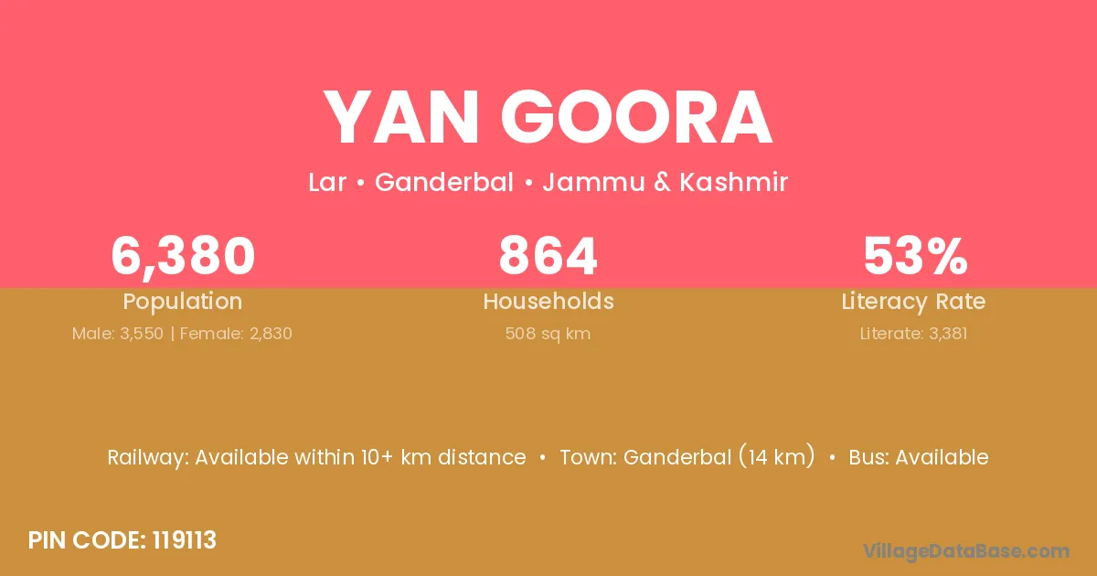 Ganderbal (14 km) is the nearest town to Yan Goora village for major economic activities and is located approximately 14 km away.