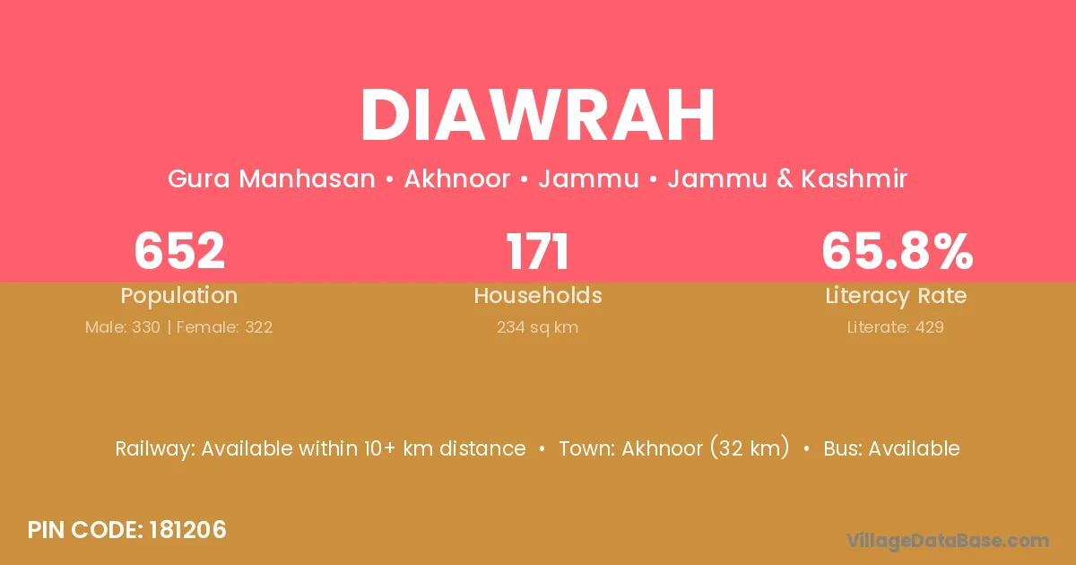 Akhnoor (32 km) is the nearest town to Diawrah village for major economic activities and is located approximately 32 km away.