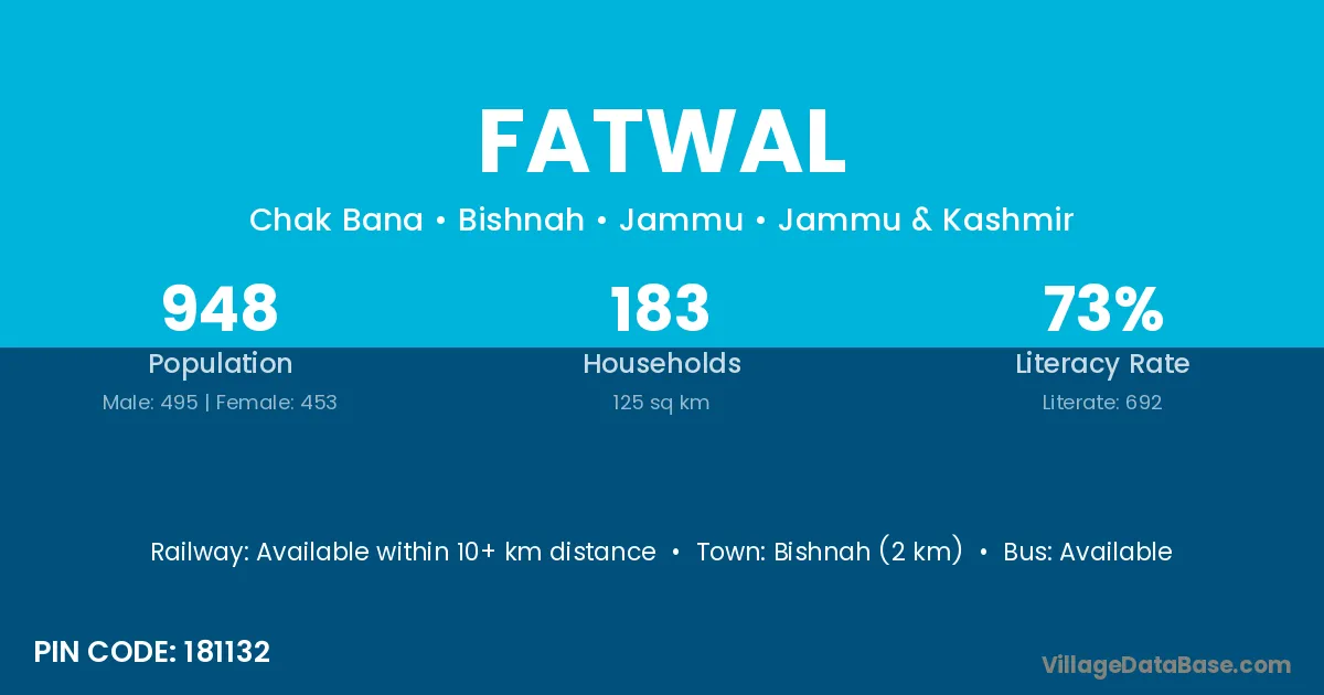 Akhnoor (12 km) is the nearest town to Fatwal village for major economic activities and is located approximately 12 km away.