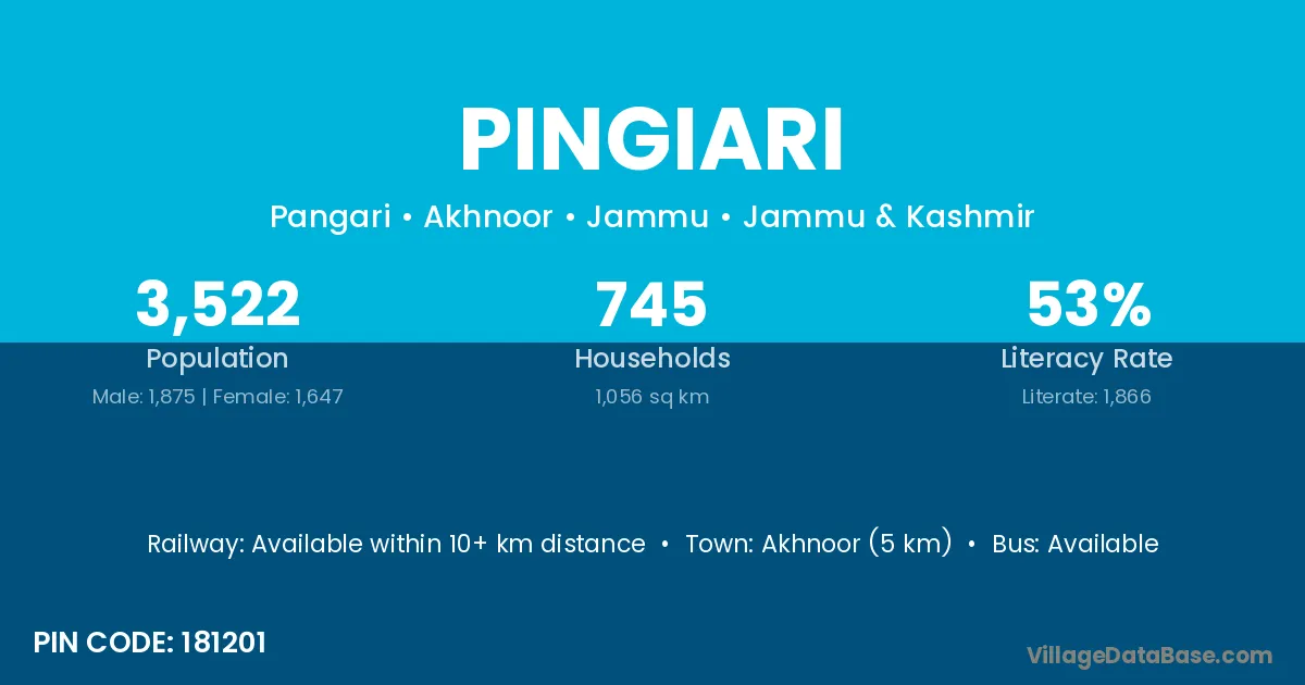 Akhnoor (5 km) is the nearest town to Pingiari village for major economic activities and is located approximately 5 km away.