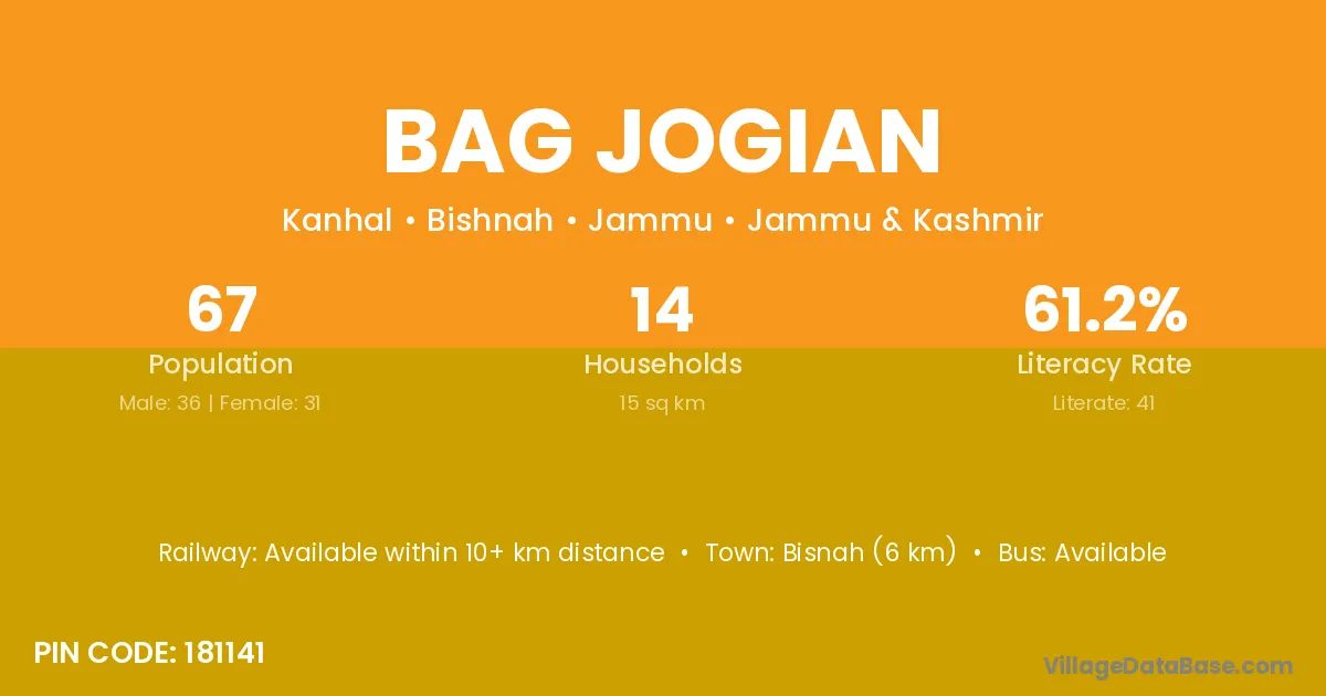 Bag Jogian village has a total population of 67 people, of which 36 are males and 31 are females.