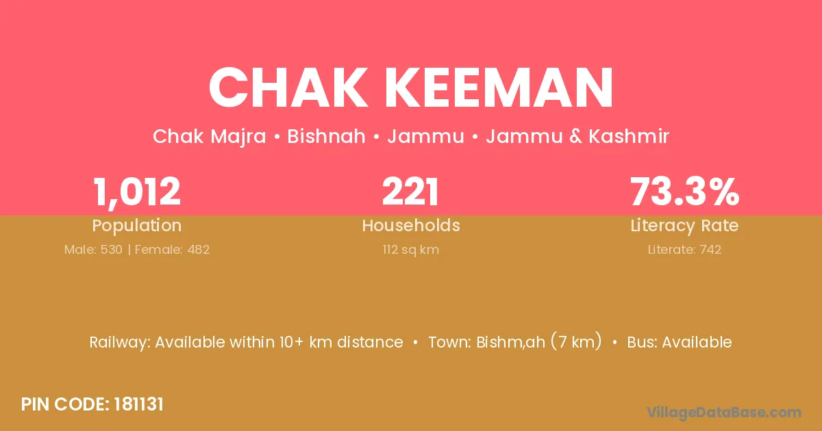 Chak Keeman village has a total population of 1,012 people, of which 530 are males and 482 are females.