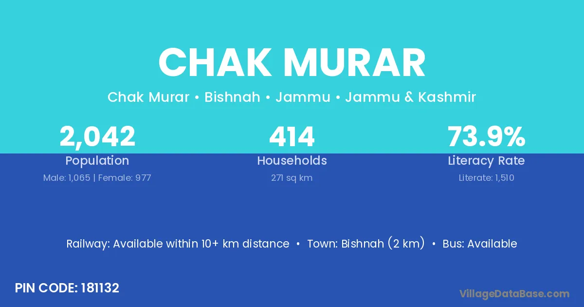 Bishnah (2 km) is the nearest town to Chak Murar village for major economic activities and is located approximately 2 km away.