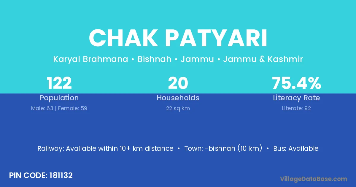 Chak Patyari village has a total population of 122 people, of which 63 are males and 59 are females.