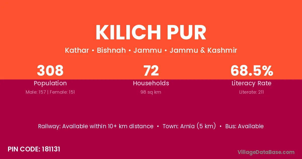 Arnia (5 km) is the nearest town to Kilich Pur village for major economic activities and is located approximately 5 km away.