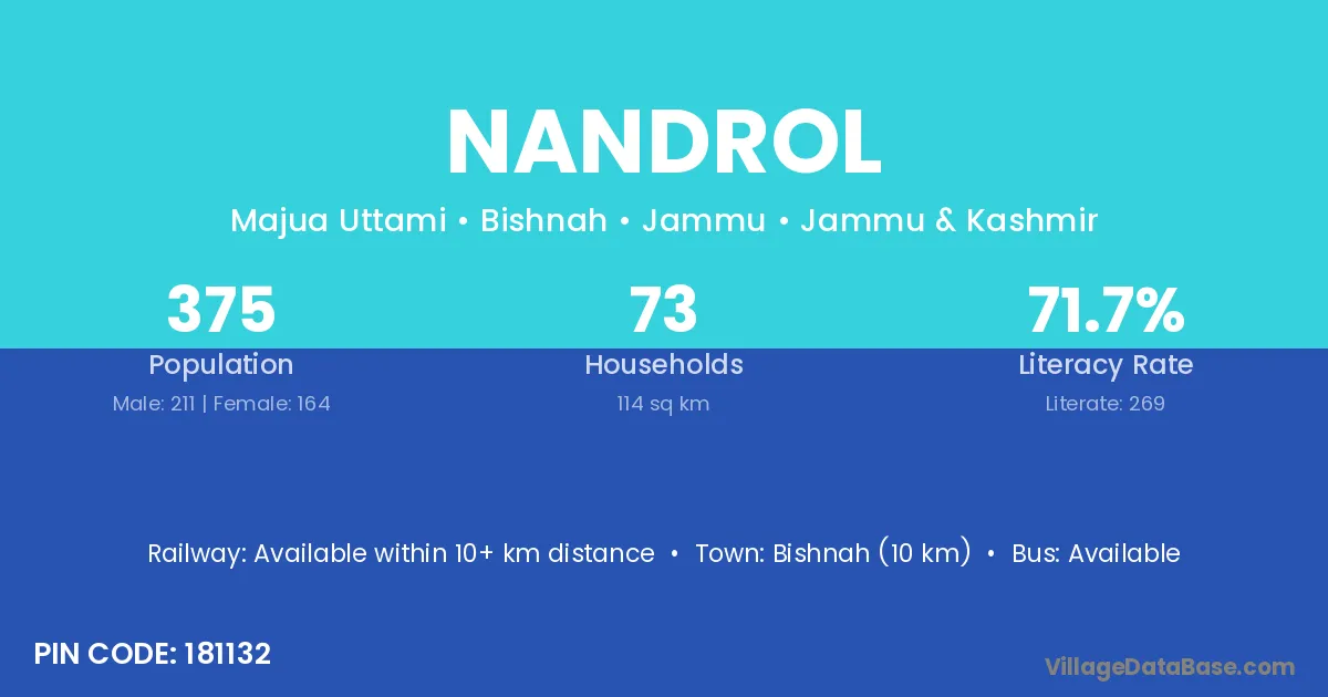 Bishnah (10 km) is the nearest town to Nandrol village for major economic activities and is located approximately 10 km away.