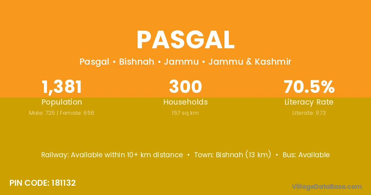 Bishnah (13 km) is the nearest town to Pasgal village for major economic activities and is located approximately 13 km away.