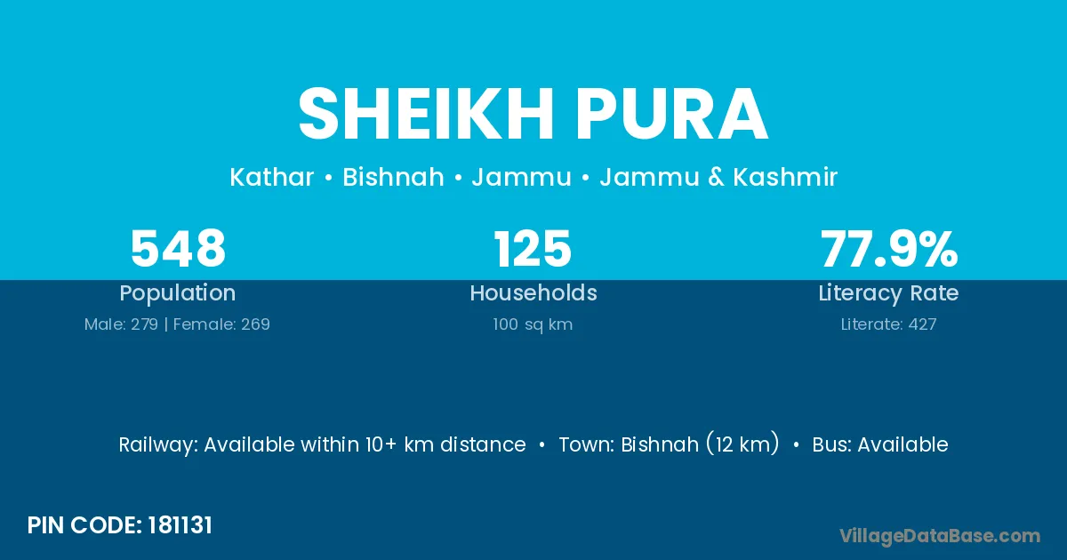 Bishnah (12 km) is the nearest town to Sheikh Pura village for major economic activities and is located approximately 12 km away.