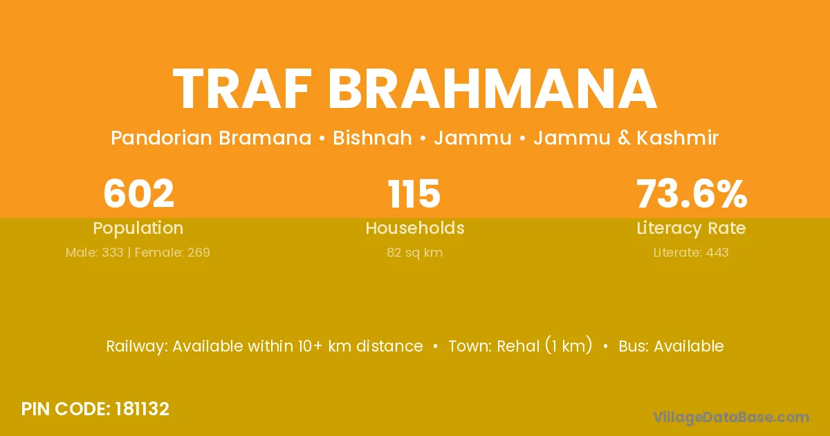 Rehal (1 km) is the nearest town to Traf Brahmana village for major economic activities and is located approximately 1 km away.