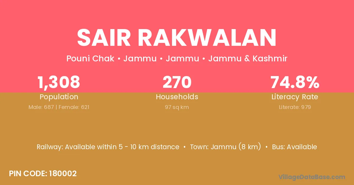 Jammu (8 km) is the nearest town to Sair Rakwalan village for major economic activities and is located approximately 8 km away.