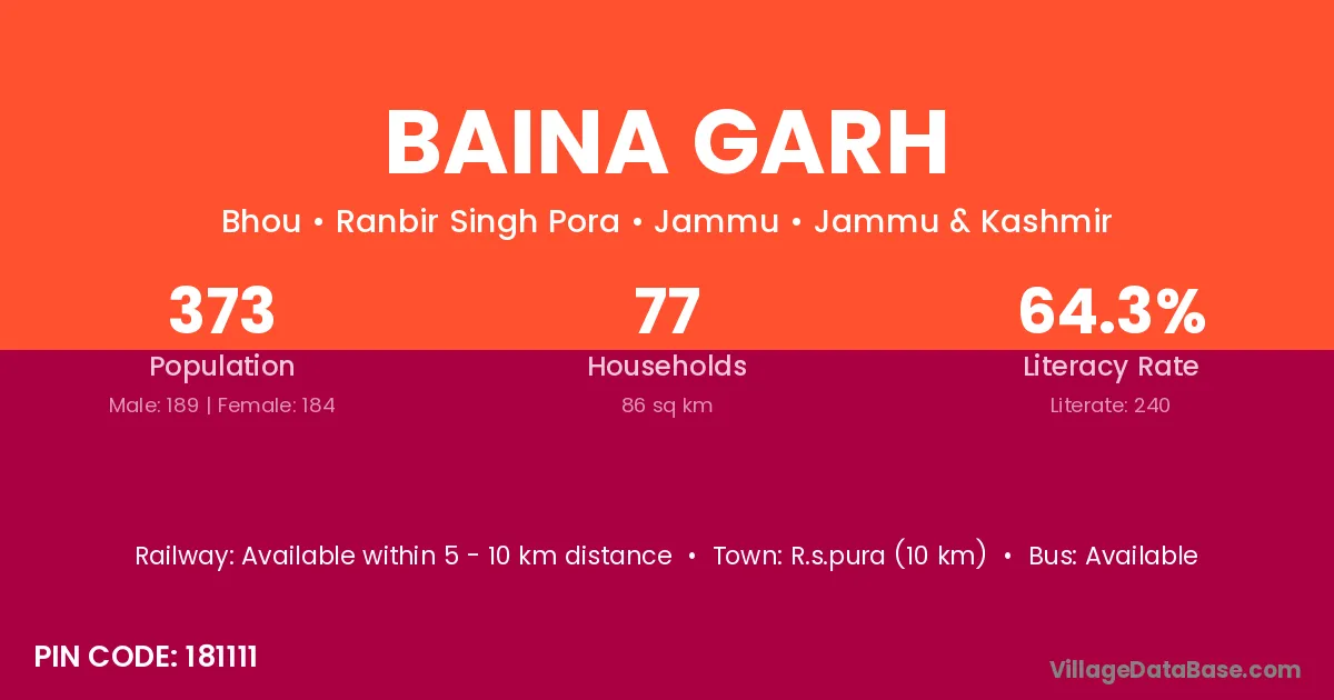 Baina Garh village has a total population of 373 people, of which 189 are males and 184 are females.