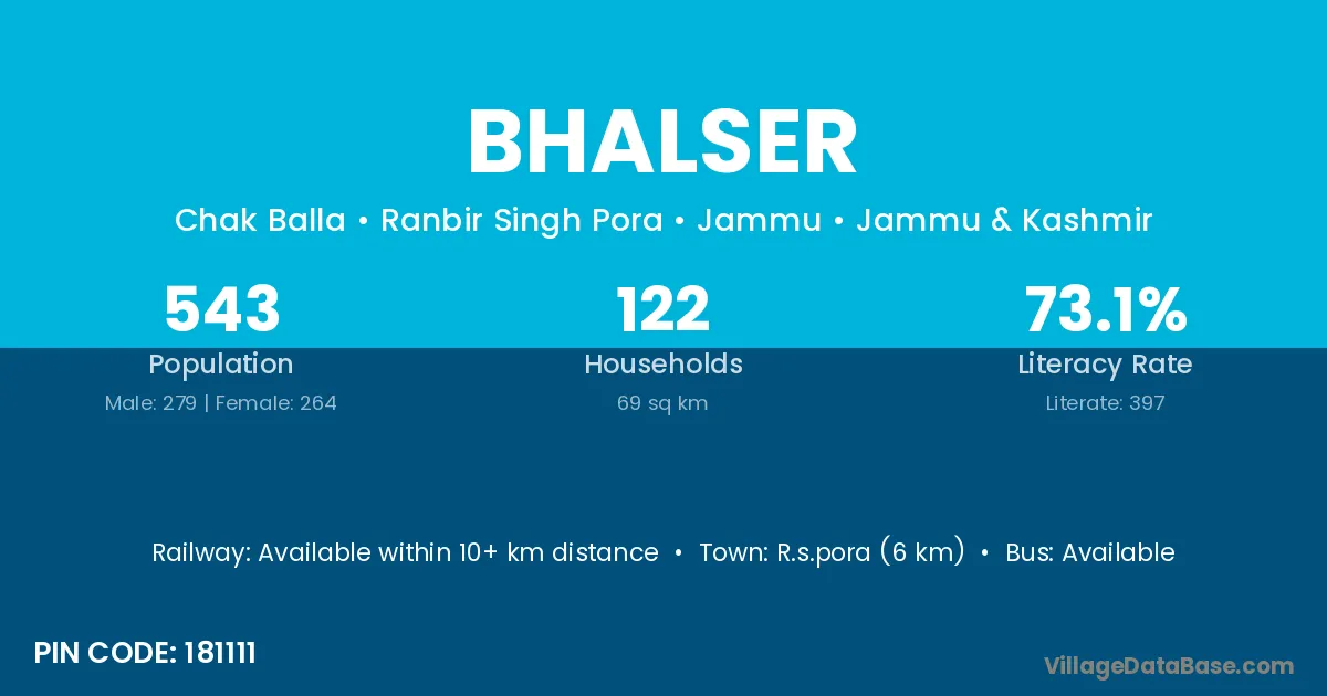R.s.pora (6 km) is the nearest town to Bhalser village for major economic activities and is located approximately 6 km away.