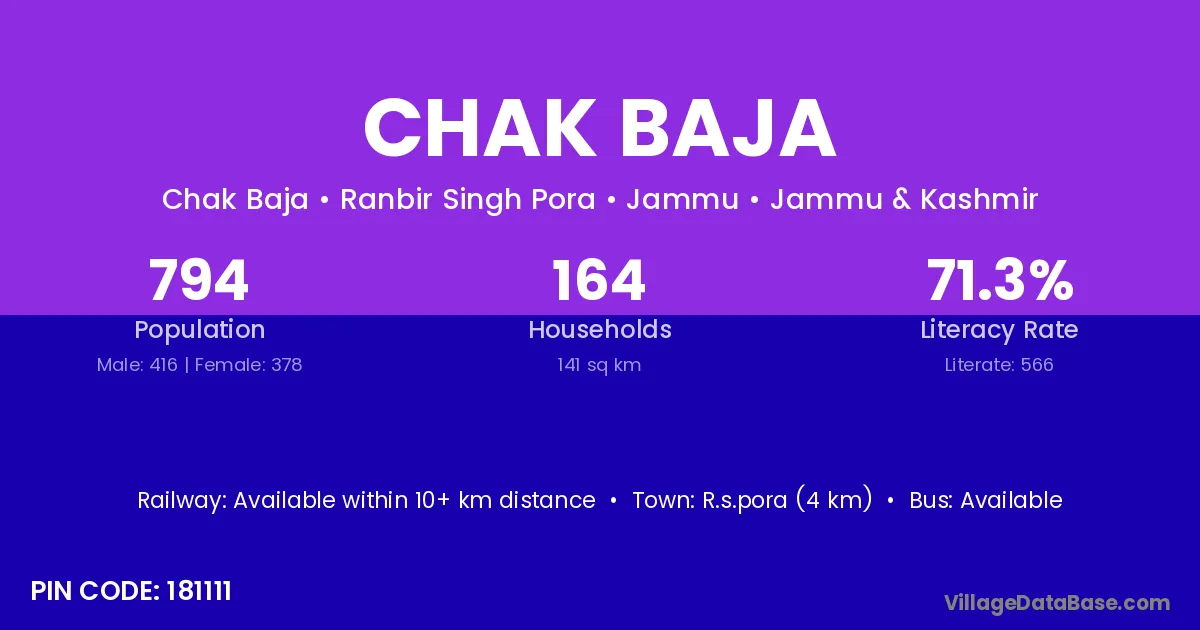 R.s.pora (4 km) is the nearest town to Chak Baja village for major economic activities and is located approximately 4 km away.