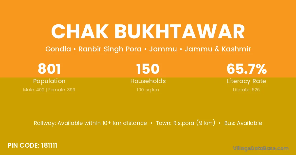 R.s.pora (9 km) is the nearest town to Chak Bukhtawar village for major economic activities and is located approximately 9 km away.