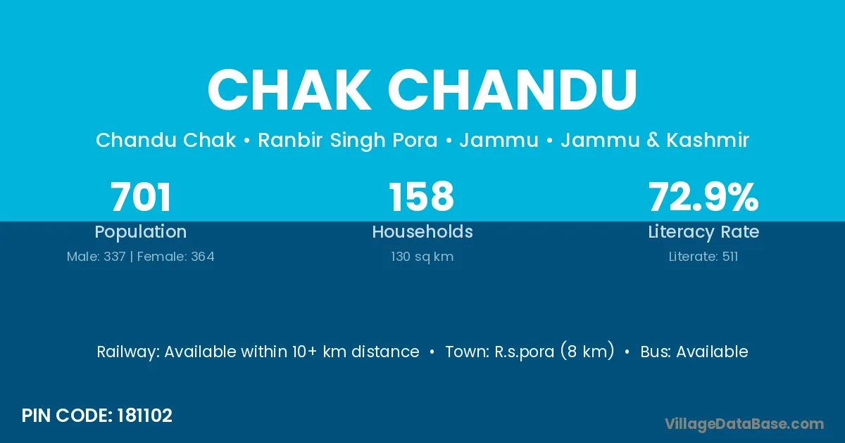 R.s.pora (8 km) is the nearest town to Chak Chandu village for major economic activities and is located approximately 8 km away.