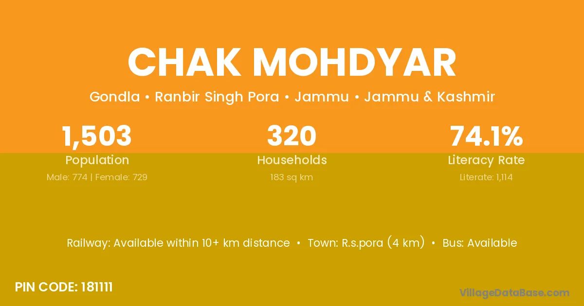 Chak Mohdyar village has a total population of 1,503 people, of which 774 are males and 729 are females.