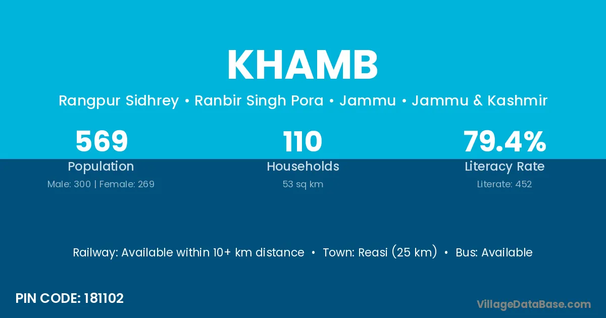 Reasi (25 km) is the nearest town to Khamb village for major economic activities and is located approximately 25 km away.