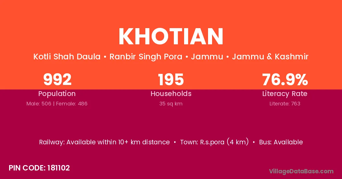 R.s.pora (4 km) is the nearest town to Khotian village for major economic activities and is located approximately 4 km away.