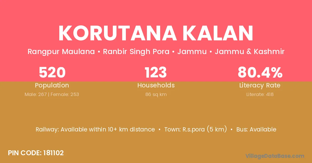 R.s.pora (5 km) is the nearest town to Korutana Kalan village for major economic activities and is located approximately 5 km away.