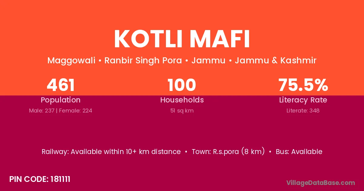 Kotli Mafi village has a total population of 461 people, of which 237 are males and 224 are females.