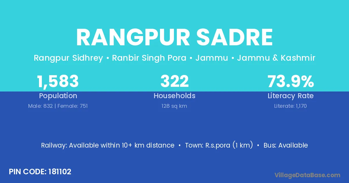 R.s.pora (1 km) is the nearest town to Rangpur Sadre village for major economic activities and is located approximately 1 km away.