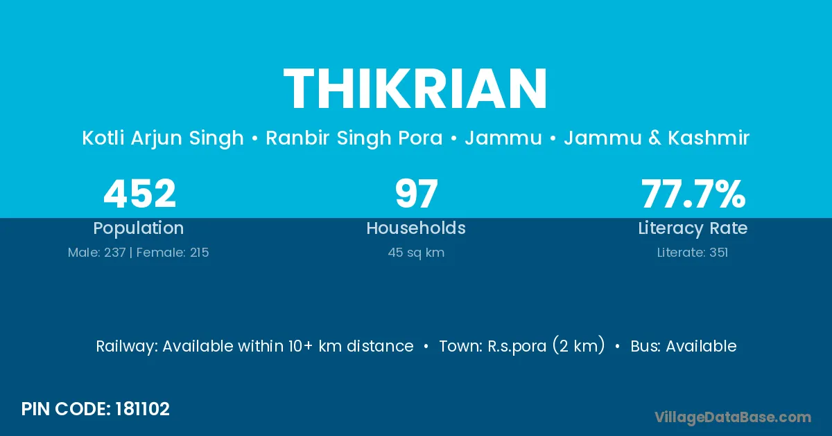 Thikrian village has a total population of 452 people, of which 237 are males and 215 are females.