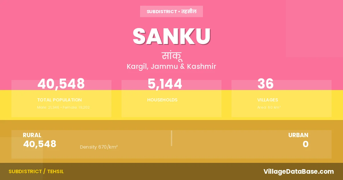 According to the 2011 census The total area of Sanku Tehsil is 60 km², with a population of 40548 people. The population density is 670 inhabitants per square kilometre, and there are approximately 5144 houses in the sub district.