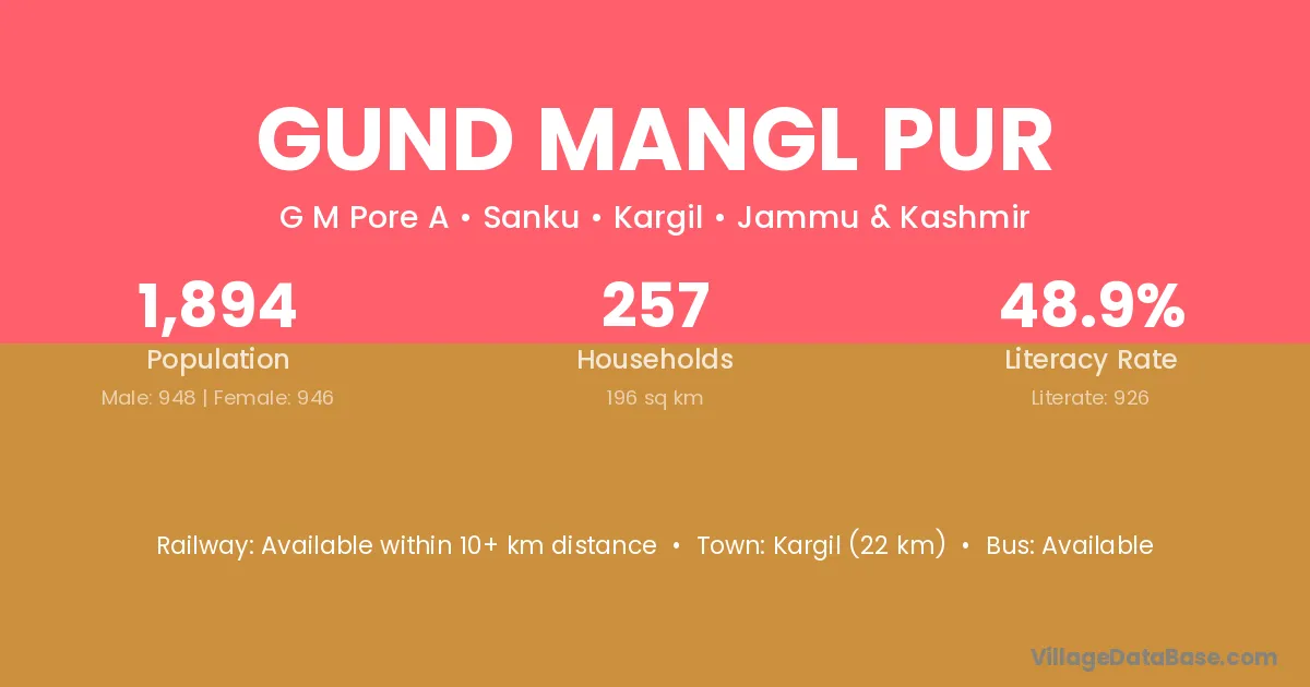 Kargil (22 km) is the nearest town to Gund Mangl Pur village for major economic activities and is located approximately 22 km away.