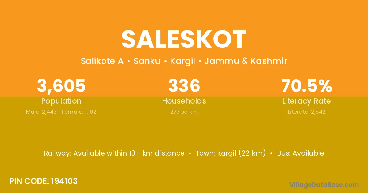 Kargil (22 km) is the nearest town to Saleskot village for major economic activities and is located approximately 22 km away.