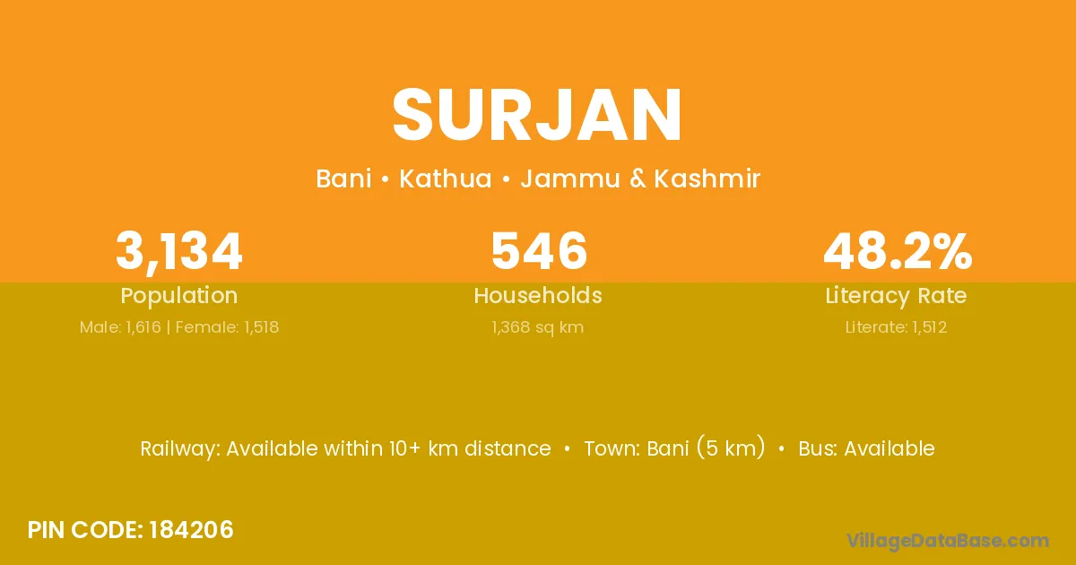 Bani (5 km) is the nearest town to Surjan village for major economic activities and is located approximately 5 km away.