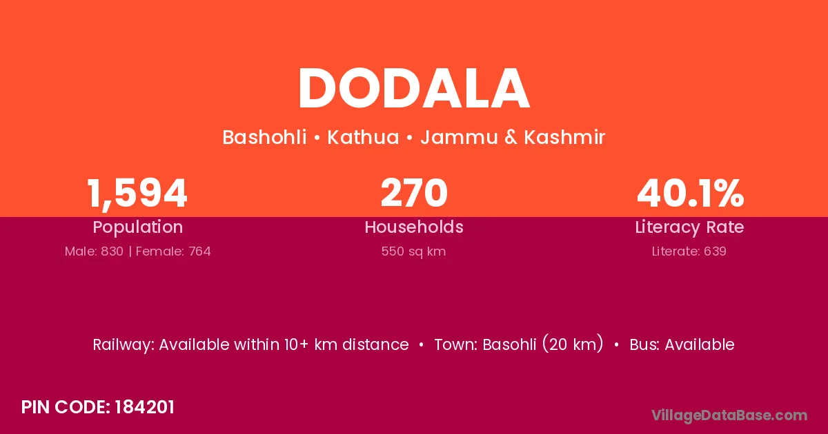 Basohli (20 km) is the nearest town to Dodala village for major economic activities and is located approximately 20 km away.
