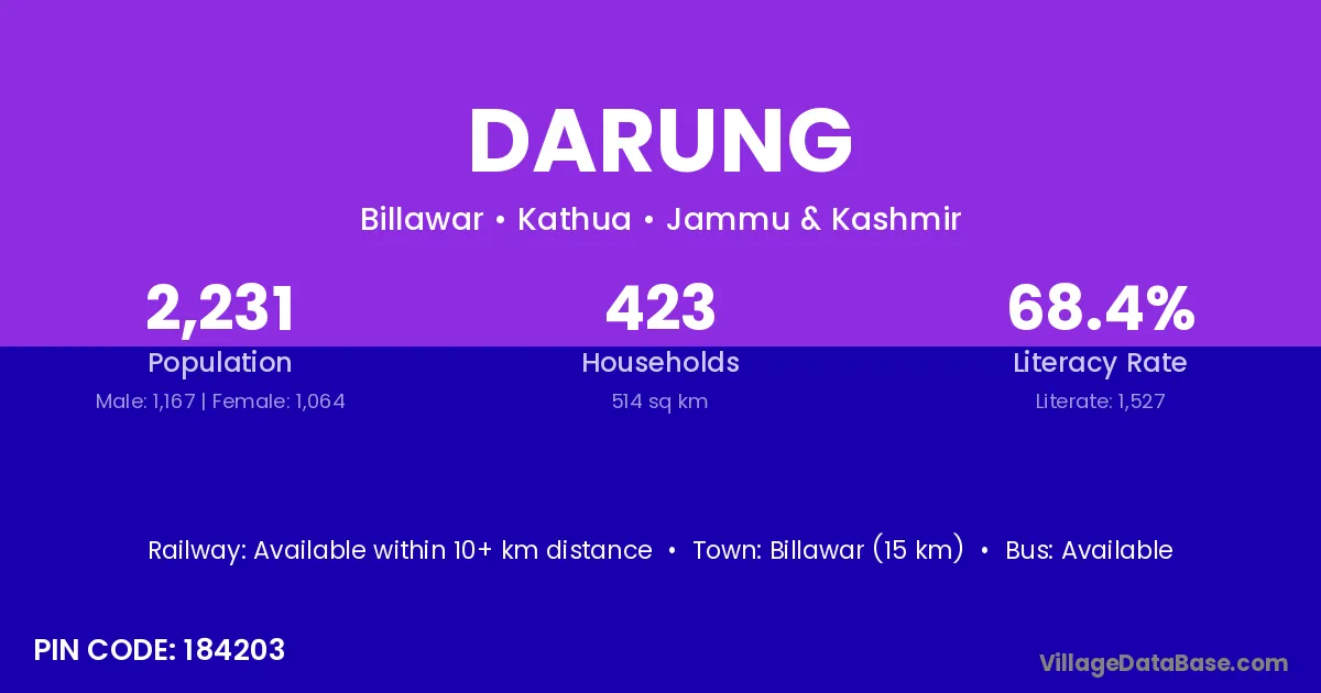 Billawar (15 km) is the nearest town to Darung village for major economic activities and is located approximately 15 km away.