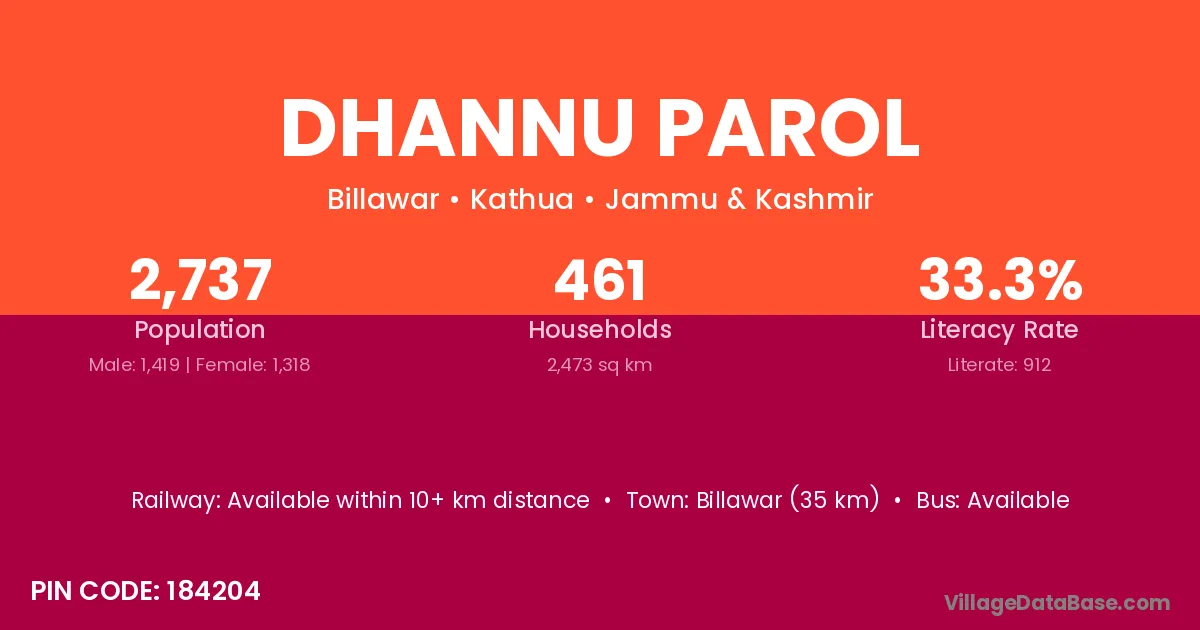 Billawar (35 km) is the nearest town to Dhannu Parol village for major economic activities and is located approximately 35 km away.