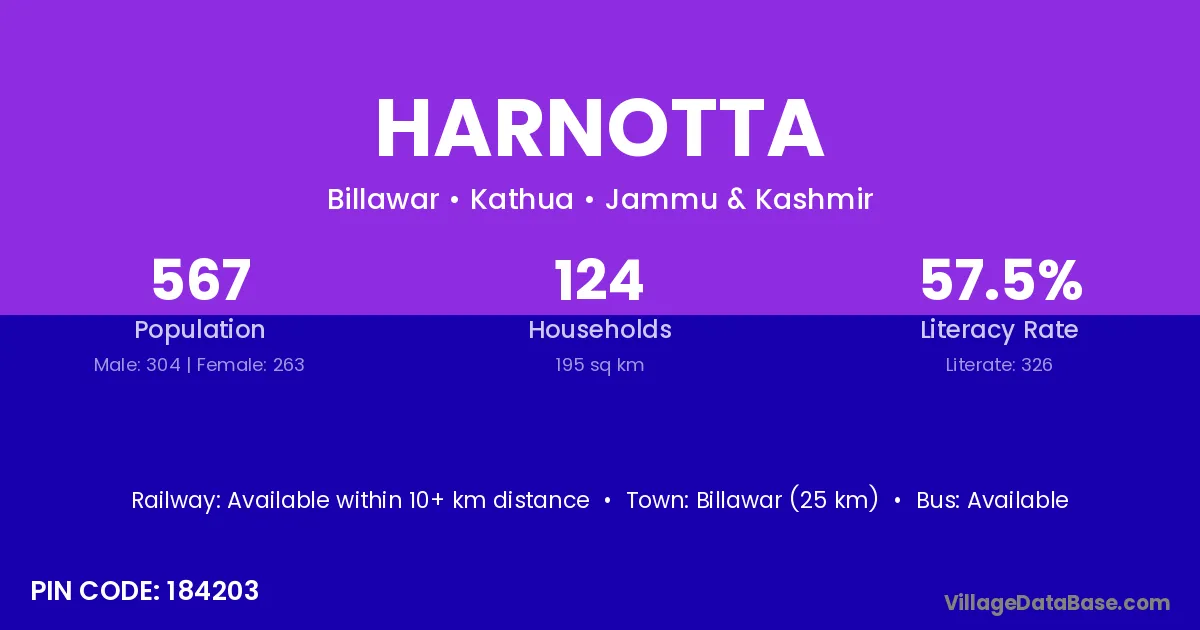Billawar (25 km) is the nearest town to Harnotta village for major economic activities and is located approximately 25 km away.