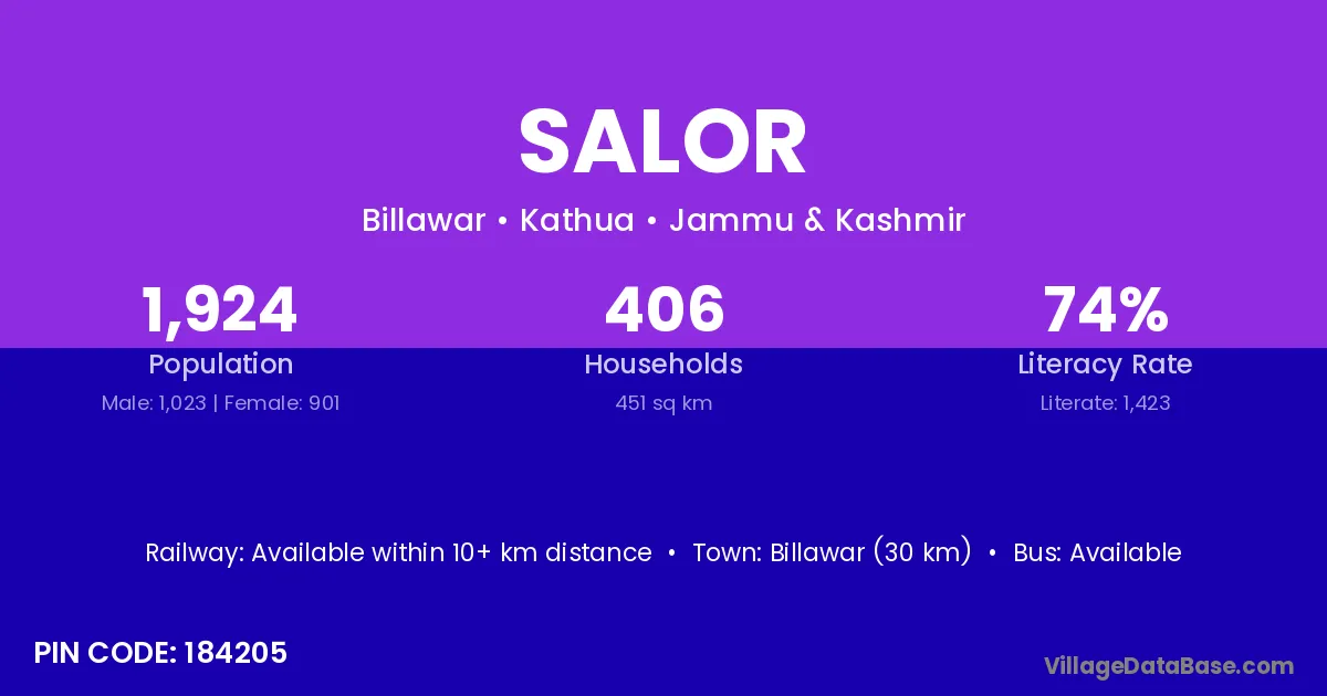 Billawar (30 km) is the nearest town to Salor village for major economic activities and is located approximately 30 km away.