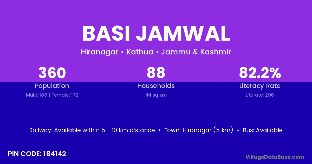 Basi Jamwal village has a total population of 360 people, of which 188 are males and 172 are females.