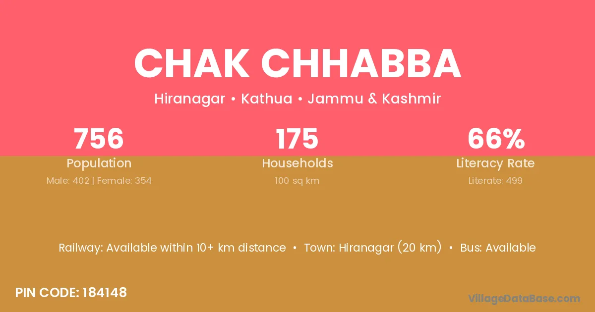 Hiranagar (20 km) is the nearest town to Chak Chhabba village for major economic activities and is located approximately 20 km away.