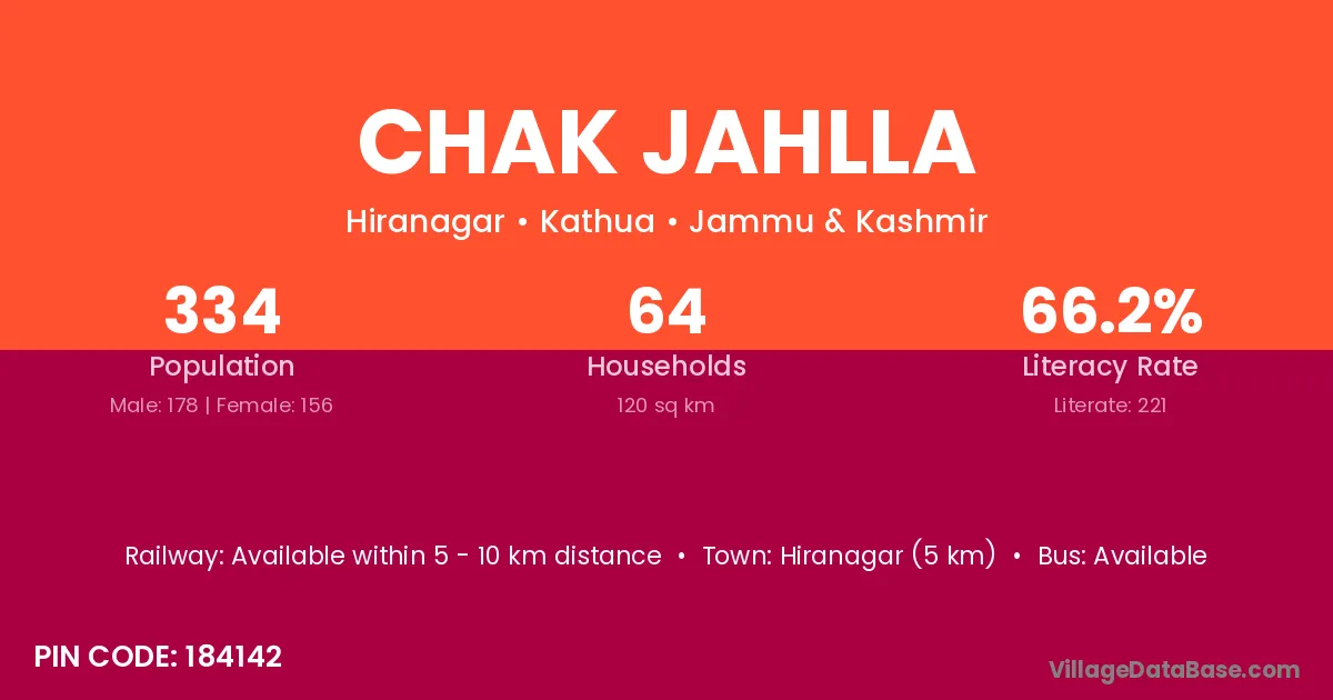 Hiranagar (5 km) is the nearest town to Chak Jahlla village for major economic activities and is located approximately 5 km away.