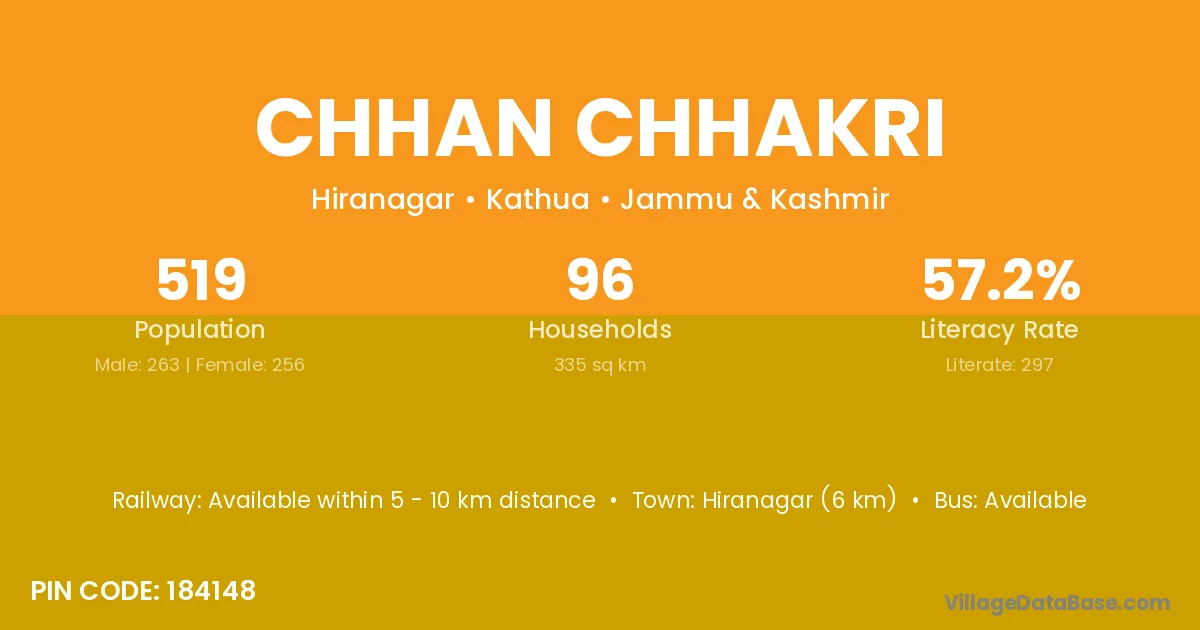 Hiranagar (6 km) is the nearest town to Chhan Chhakri village for major economic activities and is located approximately 6 km away.