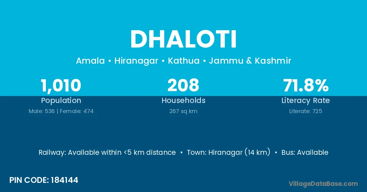 Hiranagar (14 km) is the nearest town to Dhaloti village for major economic activities and is located approximately 14 km away.