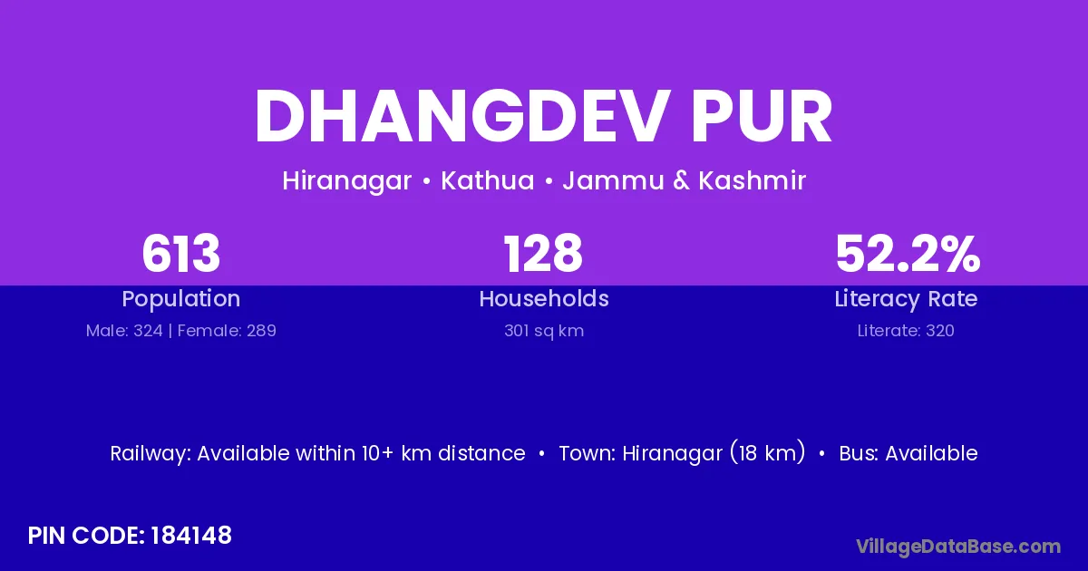 Hiranagar (18 km) is the nearest town to Dhangdev Pur village for major economic activities and is located approximately 18 km away.