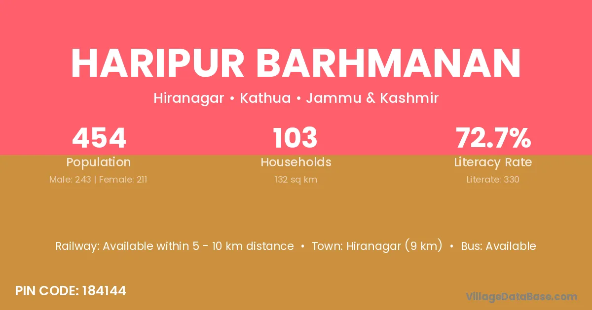 Hiranagar (9 km) is the nearest town to Haripur Barhmanan village for major economic activities and is located approximately 9 km away.