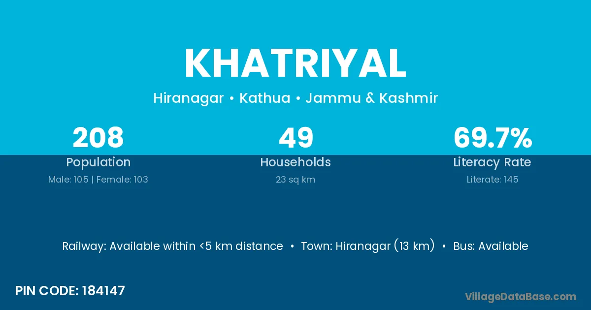 Hiranagar (13 km) is the nearest town to Khatriyal village for major economic activities and is located approximately 13 km away.