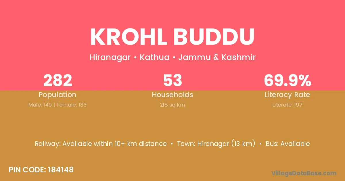 Hiranagar (13 km) is the nearest town to Krohl Buddu village for major economic activities and is located approximately 13 km away.